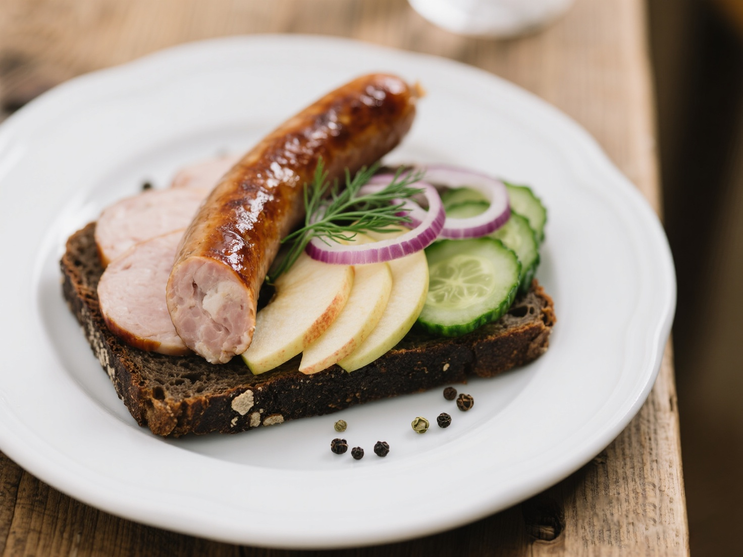 ③ 堆疊食材: 在面包片上依次鋪上:蘋果片/梨片 -> 煎好的林堡腸片 -> 酸黃瓜片 -> 紅洋蔥圈。