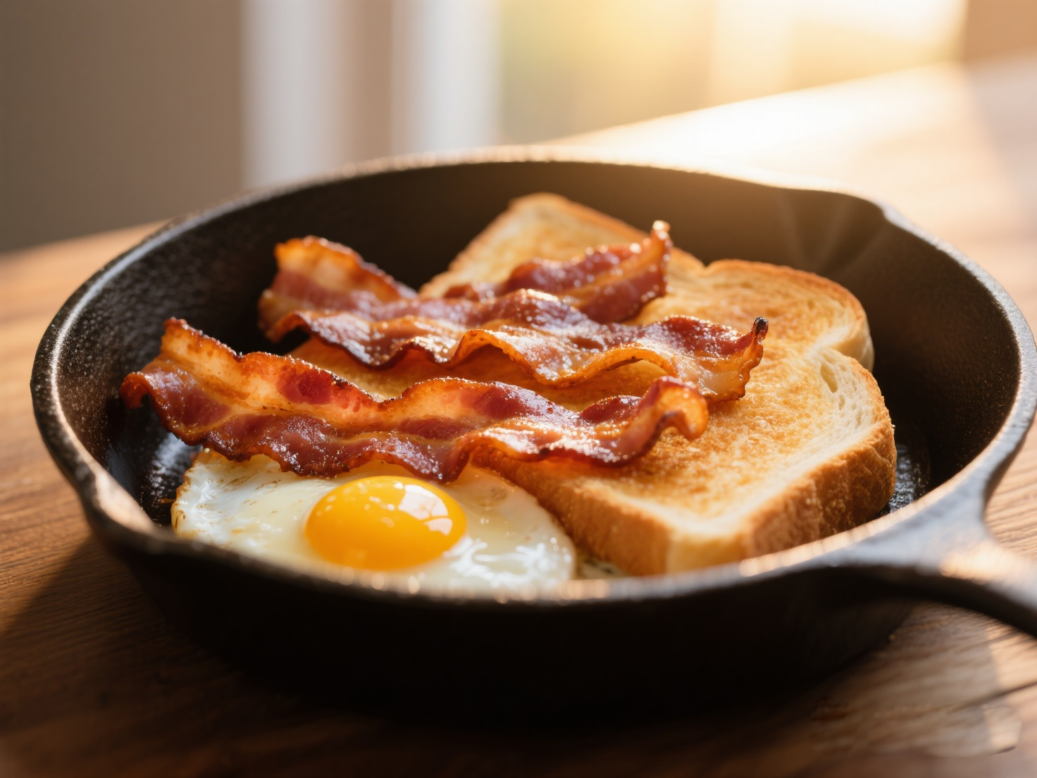 特點(diǎn):展現(xiàn)培根最原始的焦脆口感和煙熏香氣,搭配流心蛋黃,是最經(jīng)典的早餐組合。