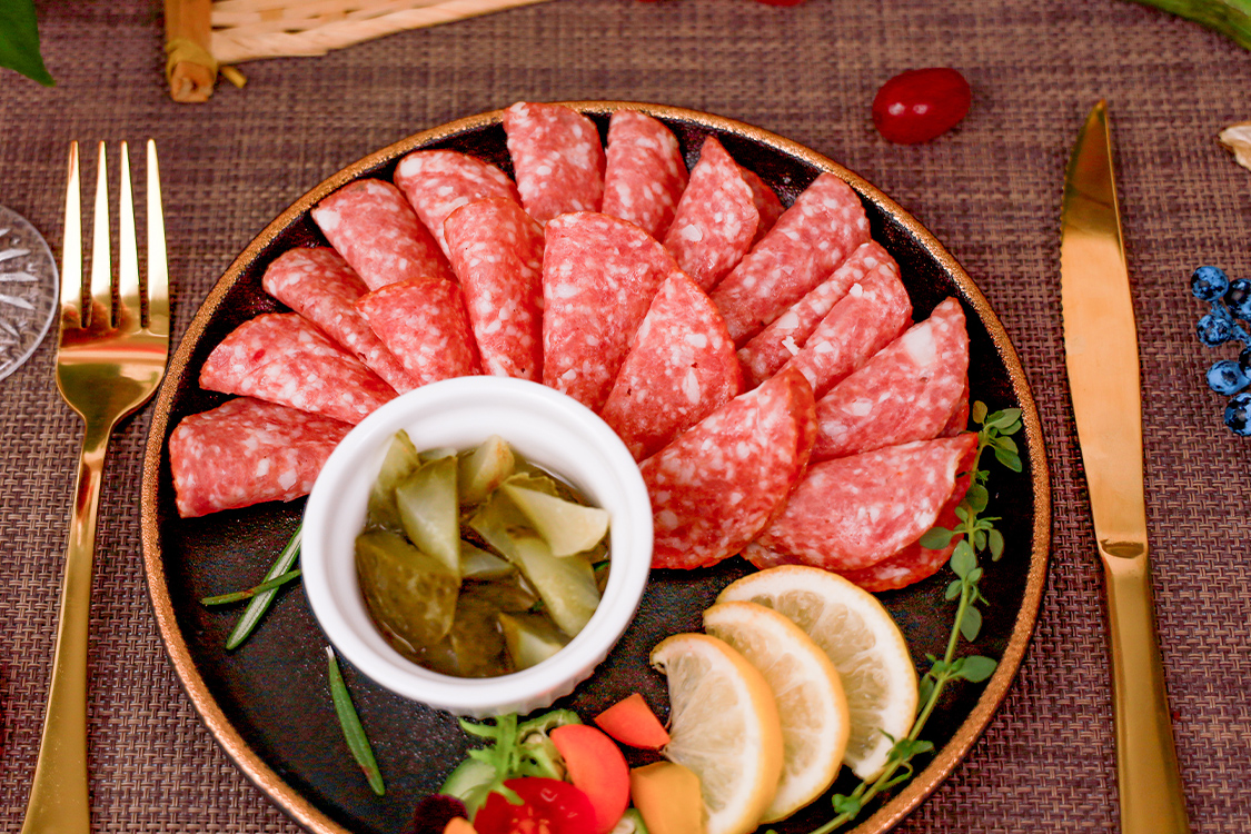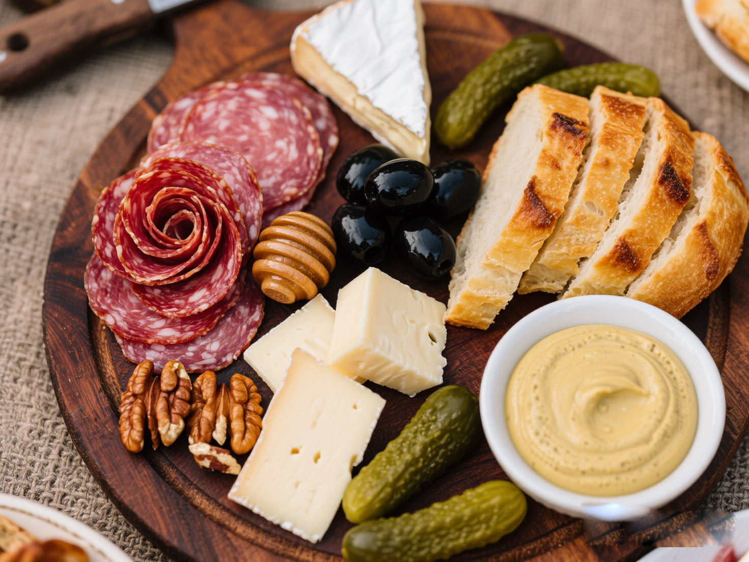 ② 在木質(zhì)砧板或大號平盤上,將薩拉米、奶酪、堅果、橄欖等分區(qū)錯落擺放,形成豐富的視覺層次;